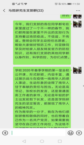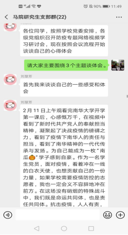 研究生刘慧芳、魏美霞、罗丹等同学表示,通过收看beats365官方网站2020年春季学期第一堂全校公开课,看到了南华人在防疫抗疫战斗中的感人事迹,看到了疫情下南华人的责任与担当,表示要从自身做起,科学防控,相信党和政府,不信谣、不传谣,引导群众坚定战胜疫情的信心。