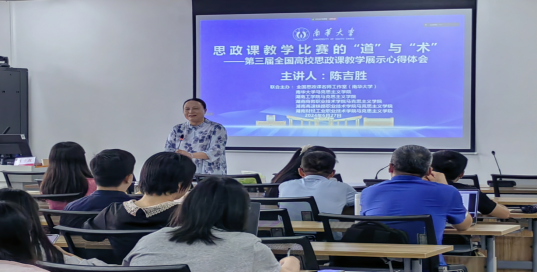 随后陈吉胜老师通过“一个高校思政课教师的自由、参加思政课比赛的心路程、第三届全国高校思政课教学展示活动”三个方面讲述了自己的比赛历程和心得体会,他通过“畏、尝、磨、和”四个字分享自己如何从一名普通思政课教师通过校赛、省赛、国赛等赛事历练和不断完善自己最终取得第三届全国高校思政课教学展示活动特等奖,并将自己国赛比赛的流程进行了详细的介绍以及比赛注意事项,陈老师指出,老师要在比赛中取得优异成绩必须要吃透教材,不断学习,拓展知识体系,才能在比赛中游刃有余。