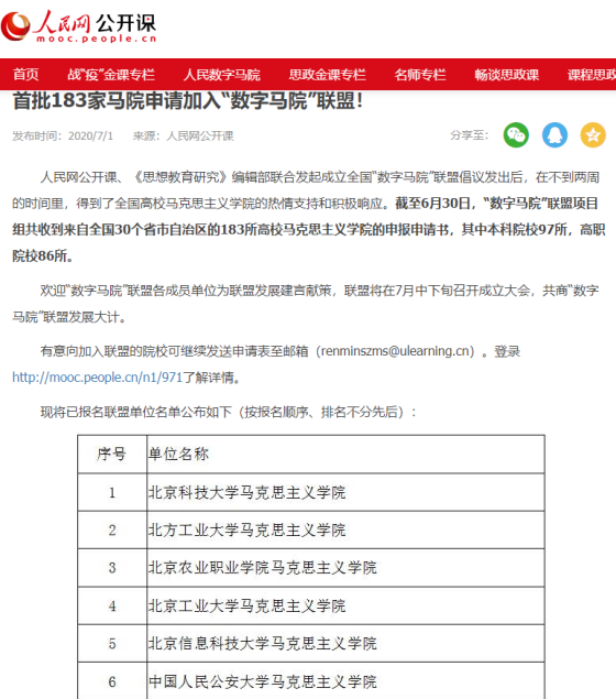 近日获悉,公司马院成为首批全国“数字马院”联盟会员单位。全国“数字马院”联盟由人民网公开课、《思想教育研究》编辑部联合发起,全国30个省市自治区的183所高校马院加盟。