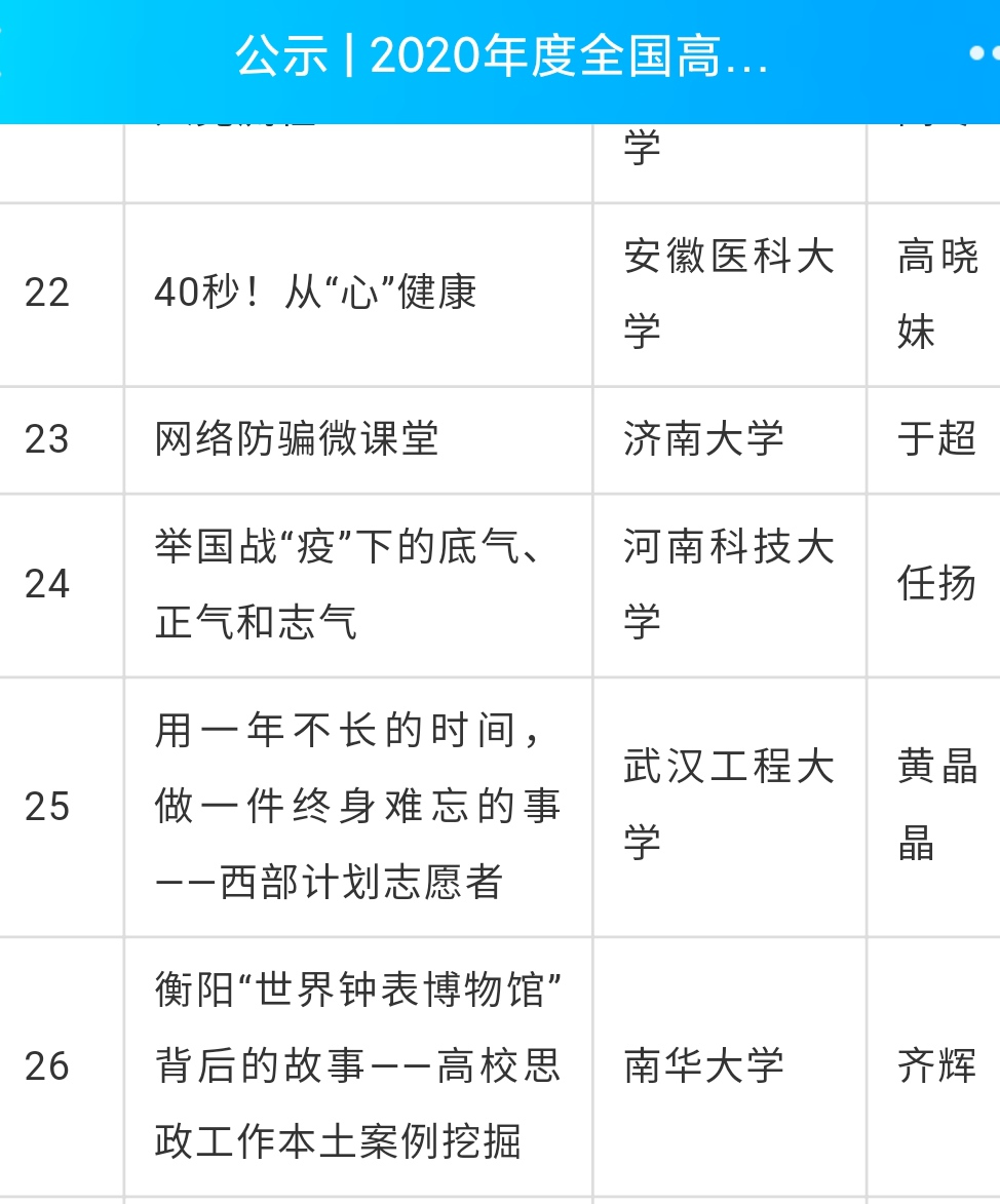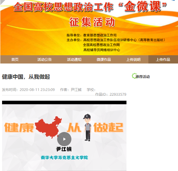 经过在全国高校思想政治工作网等媒体半年展播及专家评审,beats365官方网站尹江铖老师带领员工创作的全民抗疫动画微课《健康中国从我做起》荣获三等奖;齐辉老师创作的聚焦衡阳地方思政教育素材的微课《衡阳“世界钟表博物馆”背后的故事——高校思政工作本土案例挖掘》荣获优秀奖。