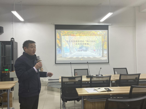 王浩斌教授从马克思早期思想“转向”的历史背景、“转向”的过程及其历史影响三个方面展开学术分享。王教授立足马恩原著,从时代因素和主体条件两个方面分析了马克思早期思想“转向”的历史背景,讲解了马克思的思想转向的原因,通过说明马克思的问题意识强调了提出问题的重要性。随后,王教授重点讲述了马克思早期思想“转向”的过程。他指出,第一次转向是从唯心主义到旧唯物主义,第二次转向是创立新唯物主义以及实现哲学革命。最后,王教授将马克思早期思想“两次转向”的历史影响概括为三点,其一是推动了无产阶级及国际共产主义运动的历史进程;其二是开创了人类解放的真正现实道路;其三是引领了近代以来社会思潮的发展。