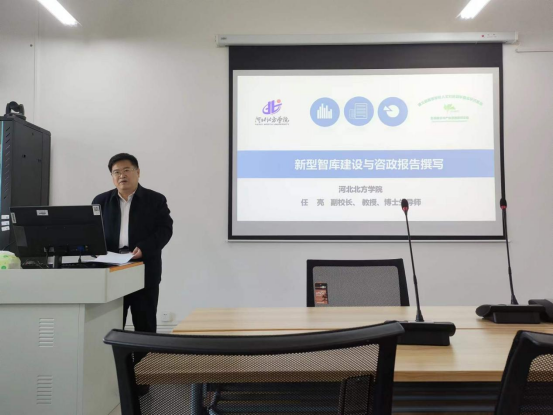 任亮教授坚持理论指导和实践探索的辩证统一,从智库建设的背景意义、发展现状、目标任务和重点举措等方面展开了学术分享。任教授根据智库发展的相关文件,并结合智库发展的现状强调,建设新型智库具有重要的现实意义。要以人文社科科研机构为依托,围绕国家和区域经济社会发展中的重大现实问题,开展咨政建言、理论创新、舆论引导、社会服务工作,为政府、企业发展提供战略性、实践性、前瞻性的政策建议,打造立足本省、服务全国、引领发展,在国内外有影响力的专业化特色新型智库,带动哲学社会科学整体发展,助力公司高质量发展。任教授针对新型智库建设的现实需求提出建议,强调要通过理顺体制机制,活跃学术交流,拓展渠道,培育人才队伍,组建专业团队,建立激励机制等途径加强特色智库建设。同时,任教授结合自身经验,介绍了他所在的智库——生态建设与产业发展研究中心,并分享了河北省高等公司人文社会科学重点研究基地的基本概况和科研成果。