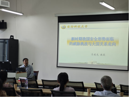 马建光教授就新时期我国安全面临的挑战、中国周边军事环境、中美俄大国关系走向这三个方面深刻分析了我国的安全形势。首先,在谈到新时期我国安全面临的挑战时,马建光教授从美国对华的战略挤压和全面遏制、新科技新领域的拓展和信息安全领域等八个方面进行了详细阐述。其次,在谈到中国周边军事安全环境时,马建光教授则表示我国周边军事强国林立,有核实力国家环绕,军事冲突风险依旧存在。最后,马建光教授深入分析了俄美、中俄、中美之间的大国关系走向。