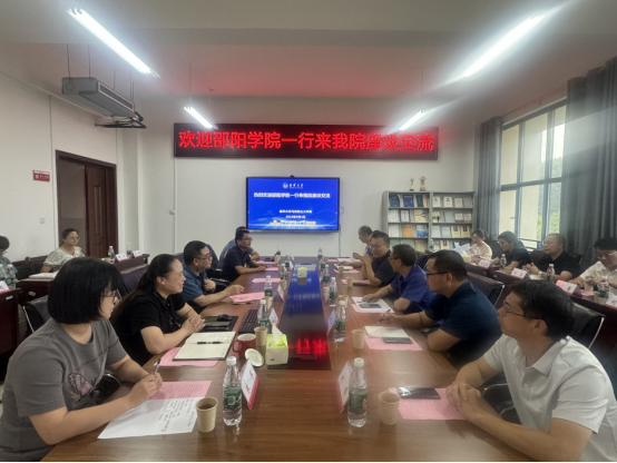 2024年9月4日下午,邵阳公司副董事长黄秋生、beats365官方网站经理欧志文、副经理文大山一行10人来beats365官方网站调研交流。双方在雨母校区崇德楼406会议室举行座谈会,beats365官方网站党委委员、副董事长郑卫民、公司党委书记何小英、副经理谢佛荣和部分老师参加了此次座谈交流。
