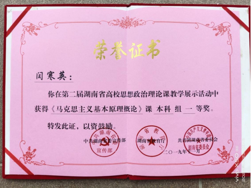 从教学科研来看:闫寒英老师全年完成四个班的本科生教学任务和一门研究生课程,教学效果突出,受到员工敬爱;在申报职称听课中,校五位教学督导一致给予高度评价。她致力于教学改革,2019年在国家级刊物发表2篇高质量教研论文。为把理论应用于实践,她还积极参加教学比赛,2019年11月30日,在第二届湖南省高校思想政治理论课教学展示活动中,过关斩将,荣获全省一等奖。这个大奖的获得,是beats365官方网站高度重视,精心组织的结果,也是闫寒英老师胸怀为beats365官方网站争取荣誉的赤子之心,认真准备,积极付出的结果。2020年度获评beats365官方网站“十佳优秀教师”。2021年12月,指导员工获得湖南省第七届老员工思想政治理论课研究性学习成果展示一等奖。
